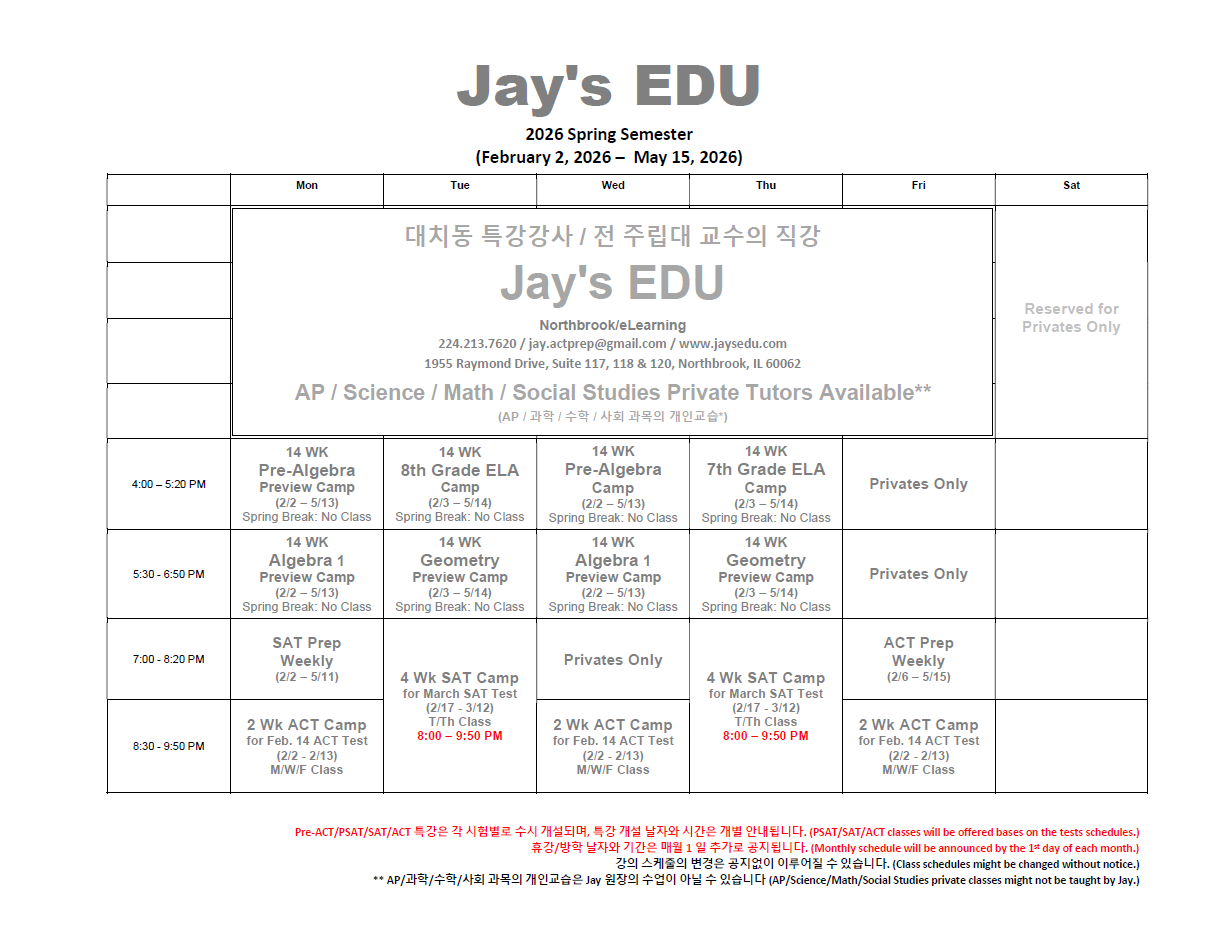 Jay’s EDU의 2026년 봄 학기 스케줄 안내입니다. Jay’s EDU 2026 Spring Semester Schedule announcement.