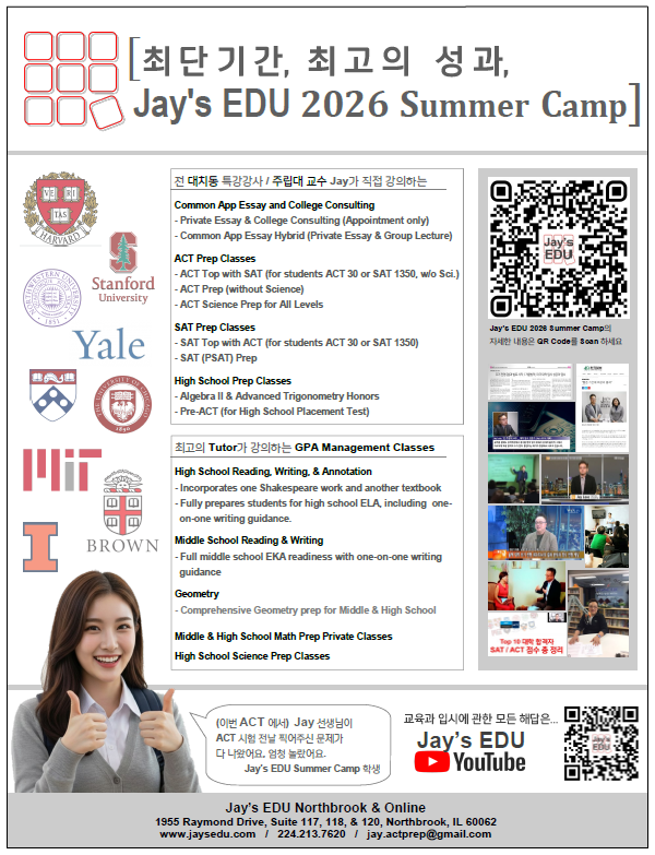 주립대학 교수 및 대치동 SAT/ACT 특강 강사가 직접 강의하며, 학생들이 짧은 기간 내 최고의 성과를 낼 수 있도록 돕는 Jay's EDU 2026 Summer Camp 일정을 안내드립니다. A state university professor and an SAT/ACT specialist will lead the ACT, Digital SAT, and other classes at Jay’s EDU. The 2026 Summer Camp schedule is designed to help students achieve outstanding results.