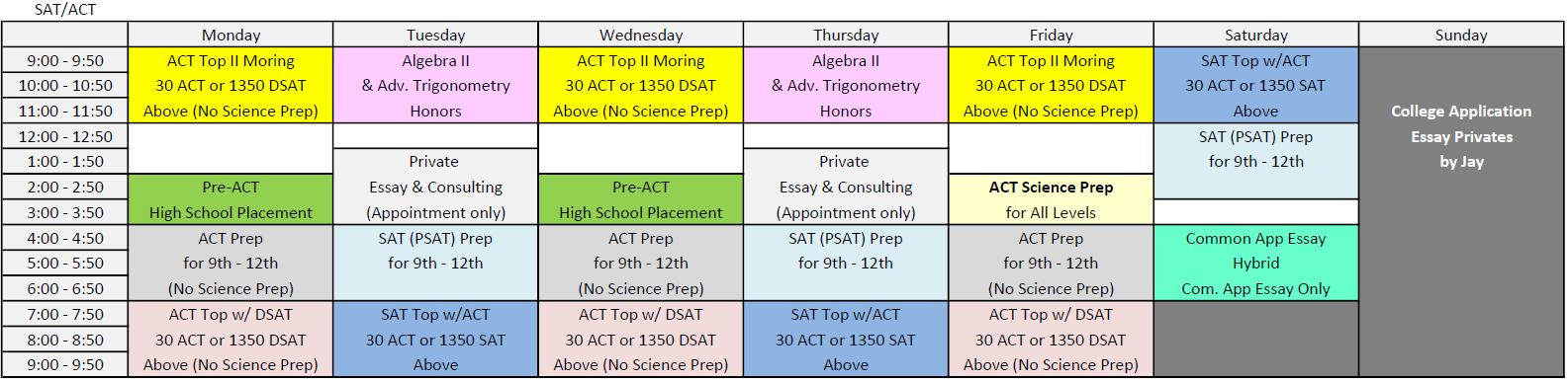 자세한 수업 스케줄은 아래에서 확인하세요. 스케줄에 나와있지 않은 수업일경우 Jay’s EDU Private Tutor의 개인 수업을 받으실 수 있습니다. Please check the detailed class schedule below. If there are classes not listed in the schedule, you can receive private lessons from Jay’s EDU Private Tutors.