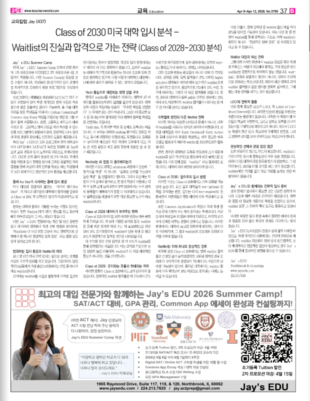 Jay’s EDU는 다년간의 경험과 실제 합격 사례를 바탕으로, 학생 개개인의 상황에 맞는 전략적 컨설팅을 제공합니다. waitlist 대응부터 전체 입시 로드맵까지, 보다 체계적이고 전문적인 접근이 필요하신 경우 Jay’s EDU를 통해 효과적인 방향을 찾으실 수 있습니다.